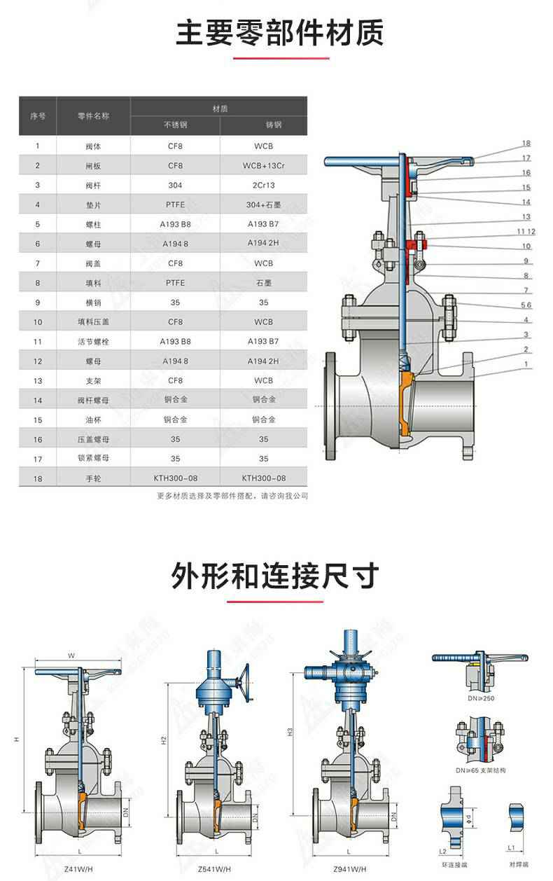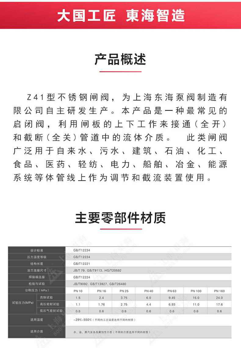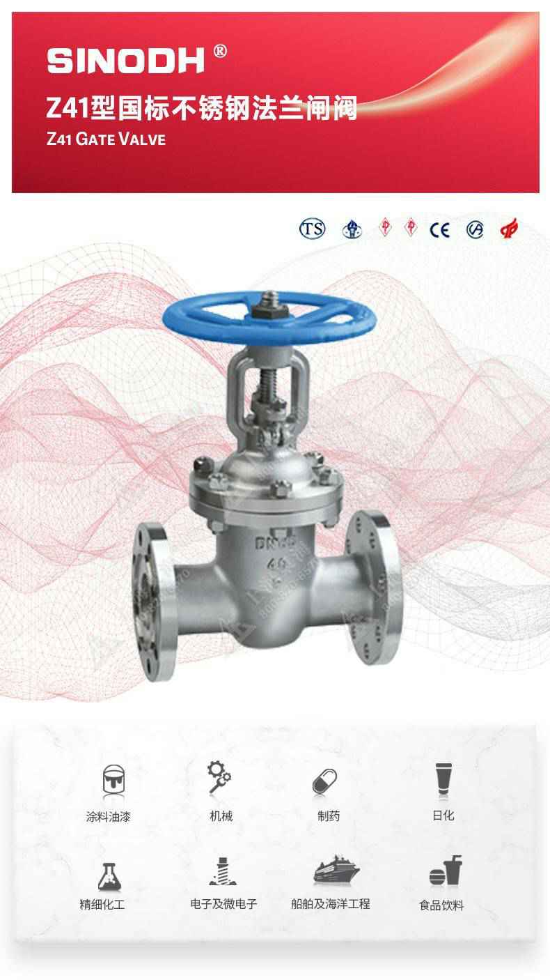 Z41型不锈钢闸阀,为火博·体育-火博(中国)自主研发生产。本产品是一种最常见的启闭阀,利用闸板的上下工作来接通(全开)和截断(全关)管道中的流体介质。此类闸阀广泛用于自来水、污水、建筑、石油、化工、食品、医药、轻纺、电力、船舶、冶金、能源系统等体管线上作为调节和截流装置使用。